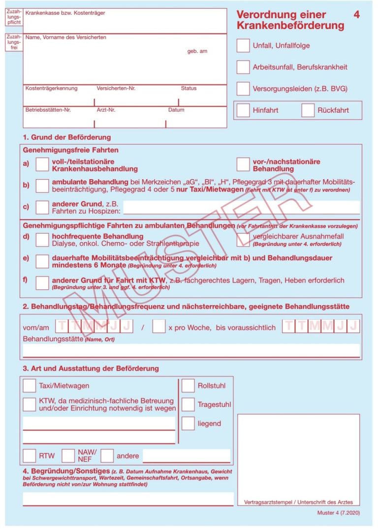 Für Patienten, die gesundheitlich eingeschränkt sind, übernehmen die gesetzlichen Krankenversicherungen in bestimmten Fällen die Fahrkosten für Ihr Taxi. Dies gilt zum Beispiel für notwendige Fahrten zu stationären Behandlungen im Krankenhaus oder zur Dialyse. Ob die Fahrt medizinisch notwendig ist, bestätigt der zuständige Arzt. Einen entsprechenden Antrag auf Fahrkosten stellen Sie bei ihrer Krankenkasse. Manche Fahrten müssen nicht von der Krankenkasse genehmigt werden - ein Transportschein reicht dann aus. Das gilt zum Beispiel für stationäre Entlassungsfahrten.